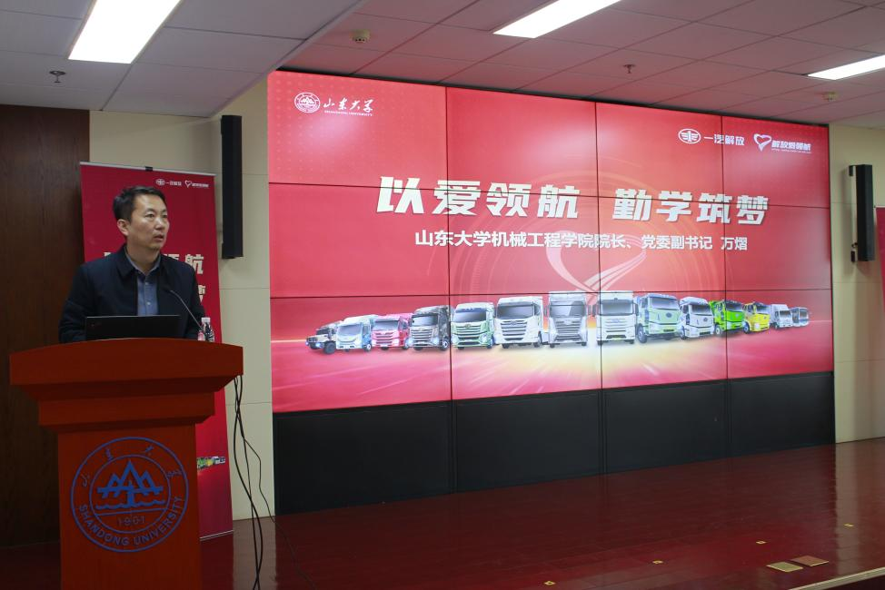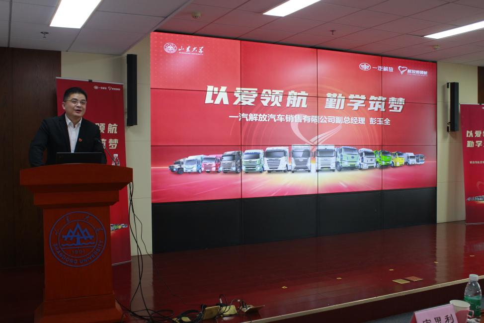 一汽解放汽车销售有限公司副总经理彭玉全介绍企业发展现状与未来规划,强调了人才对于汽车行业创新发展的关键作用。他表示,js6668金沙登录入口深厚的学术底蕴和优秀的人才储备,与一汽解放的发展理念高度契合。通过设立奖学金,企业希望加强校企联系,吸引更多优秀山大学子投身汽车产业,为行业发展注入新鲜血液。